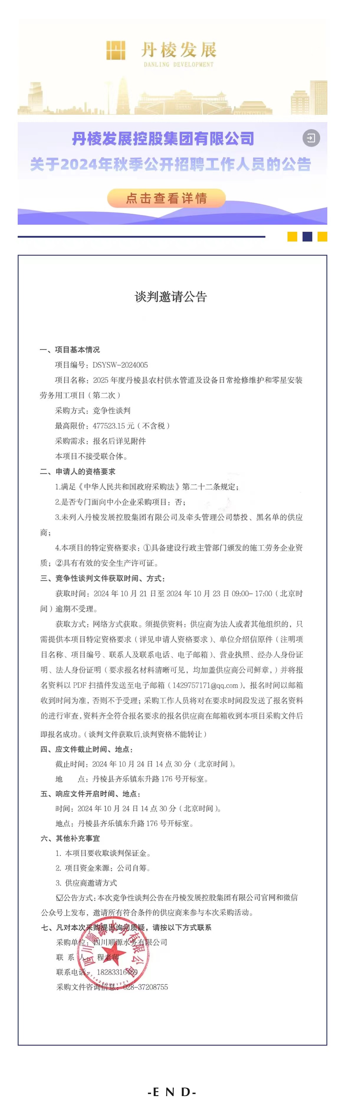 2025年度丹棱縣農(nóng)村供水管道及設(shè)備日常搶修維護(hù)和零星安裝勞務(wù)用工項目第二次談判邀請公告