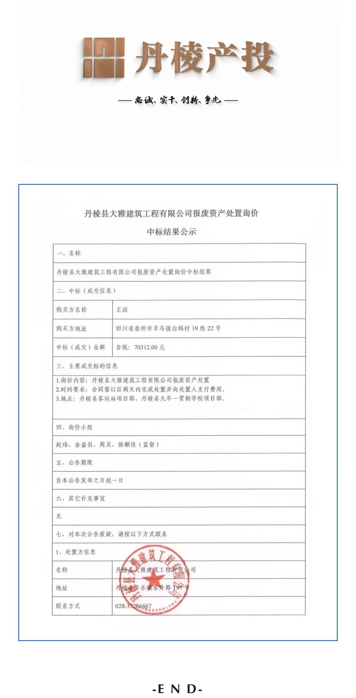 丹棱縣大雅建筑工程有限公司報廢資產(chǎn)處置詢價中標結果公示