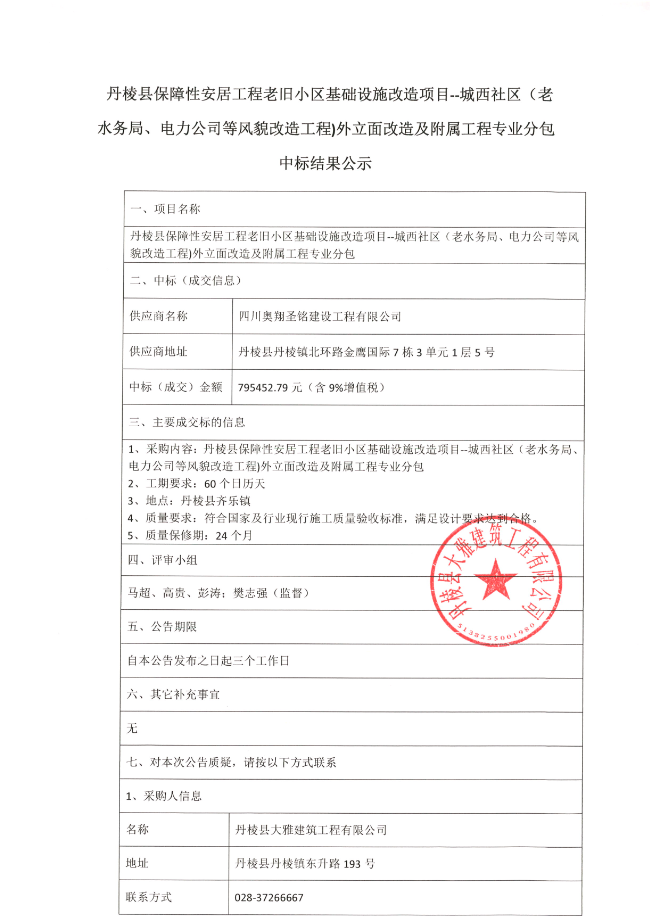 【大雅建筑公司】丹棱縣保障性安居工程老舊小區(qū)基礎設施改造項目--城西社區(qū)(老水務局、電力公司等風貌改造工程)外立面改造及附屬工程專業(yè)分包中標結(jié)果公示
