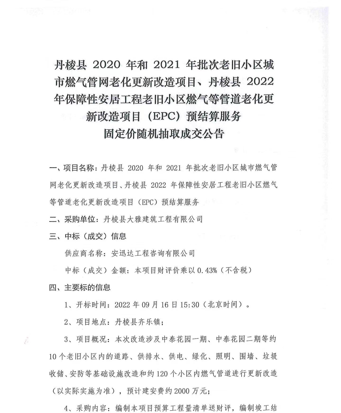 丹棱縣 2020 年、2021年及2022年批次老舊小區(qū)城市燃氣管網(wǎng)老化更新改造項目預(yù)結(jié)算服務(wù)固定價隨機抽取成交公告