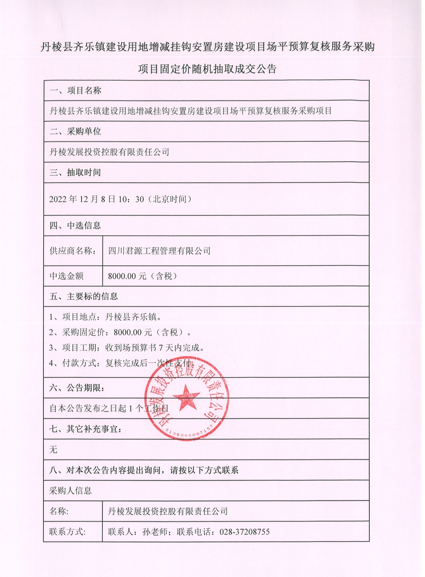 丹棱縣齊樂鎮(zhèn)建設(shè)用地增減掛鉤安置房建設(shè)項(xiàng)目場(chǎng)平預(yù)算復(fù)核服務(wù)采購項(xiàng)目固定價(jià)隨機(jī)抽取成交公告