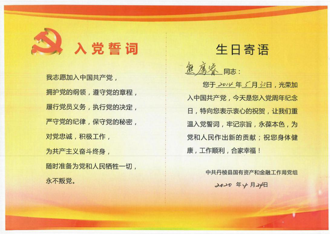 工作安排后,縣國資金融局黨組集體為5月入黨黨員過政治生日,縣國資金融局(縣金融服務(wù)中心)副主任茍永慶同志過生日的黨員們送上精心制作的“黨員政治生日卡”,勉勵(lì)黨員同志要“常思入黨初衷、銘記入黨誓詞、牢記黨員義務(wù)”,發(fā)揮黨員先鋒模范作用,在今后的工作中不斷創(chuàng)先爭優(yōu),做好表率。活動(dòng)最后,全體黨員同志在縣國資金融局黨組成員、副局長潘國榮同志的帶領(lǐng)下重溫入黨誓詞、面對(duì)黨旗莊嚴(yán)宣誓。
